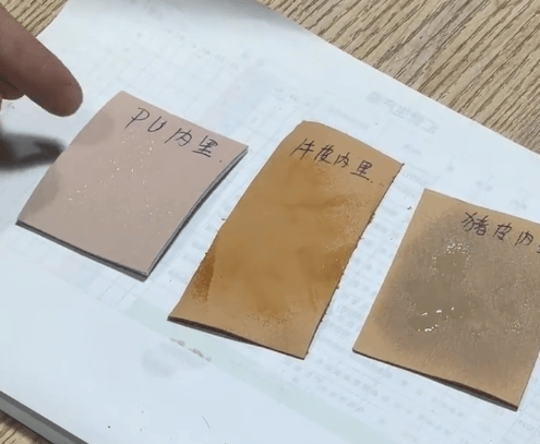 我们对三种常见的内里材质(PU、牛皮、猪皮)进行了测试,结果就发现猪皮的吸水性最好!▼