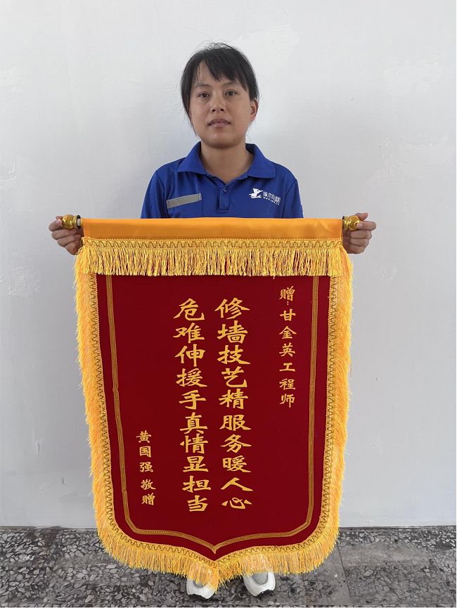 令人感动的是,在确保用户安全后,甘金英并未就此离开,而是继续完成墙面修补。事后,她也收到了黄大爷康复的消息以及一面承载感激的锦旗。